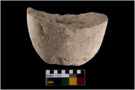 | Description / विवरण | A partially broken specimen of an oval shaped rubber stone with oval section and concave end. It is made up from sandstone. |