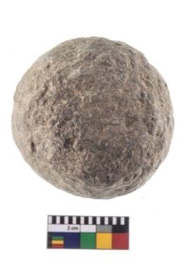 | Description / विवरण | A partially broken speciemen of stone sling ball, small in size, flat base and with smooth surface. |