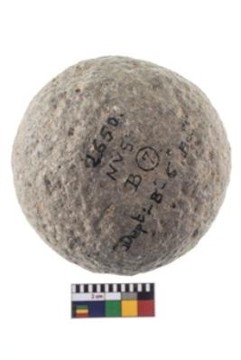 | Description / विवरण | A partially broken speciemen of stone sling ball, small in size, flat base and with smooth surface. |
