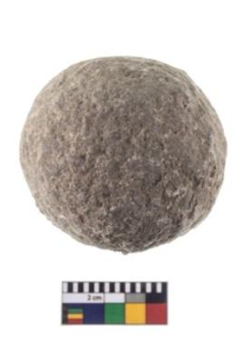| Description / विवरण | A partially broken speciemen of stone sling ball, small in size, flat base and with smooth surface. |