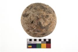 | Description / विवरण | A partially broken specimen of a circular shaped hammer stone made up from quartz |