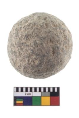 | Description / विवरण | A partially broken speciemen of stone sling ball, small in size, flat base and with smooth surface. |