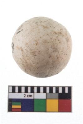 | Description / विवरण | A partially broken speciemen of stone sling ball, small in size, flat base and with smooth surface. |