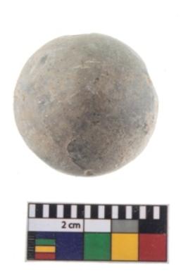 | Description / विवरण | A partially broken speciemen of stone sling ball, small in size, flat base and with smooth surface. |