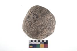 | Description / विवरण | A partially broken specimen of roughly round shaped hammer stone with battered periphery along with the circumference. |