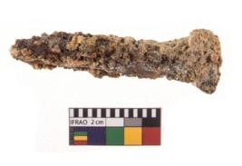 | Description / विवरण | A specimen fragment of nail having pointed functional end, extended horizontally to one side. |