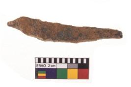 | Description / विवरण | A specimen fragment of nail having pointed functional end, extended horizontally to one side. |