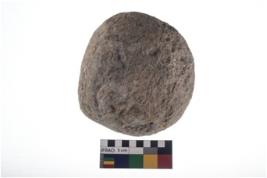 | Description / विवरण | A partially broken specimen of roughly round shaped hammer stone with battered periphery along with the circumference. |