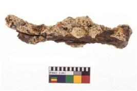 | Description / विवरण | A specimen fragment of nail having pointed functional end, extended horizontally to one side. |