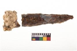 | Description / विवरण | A specimen fragment of nail having pointed functional end, extended horizontally to one side. |