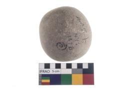| Description / विवरण | A partially broken specimen of roughly round shaped hammer stone with battered periphery along with the circumference. |