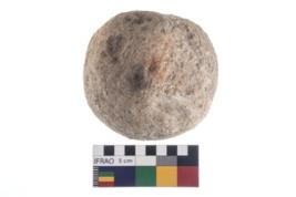 | Description / विवरण | A partially broken specimen of roughly round shaped hammer stone with battered periphery along with the circumference. |