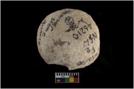 | Description / विवरण | A hammer stone round in shape partly broken with one woking edge. |