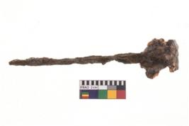 | Description / विवरण | A specimen fragment of nail having pointed functional end, extended horizontally to one side. |