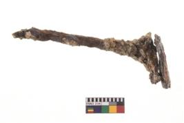 | Description / विवरण | A specimen fragment of nail having pointed functional end, extended horizontally to one side. |