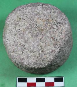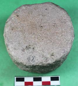 | Description / विवरण | Rubbing stone grinder with a circular base, having rough surface. It is red in colour. |