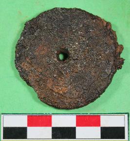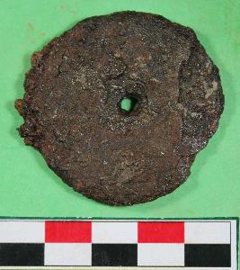 | Description / विवरण | Incrusted iron wheel with circular in shaped with center perforatrion and having rusted. It is brown in colour. |
