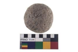 | Description / विवरण | A partially broken specimen of stone sling ball, It is roughly rounded shaped and small in size,with smooth surface. |