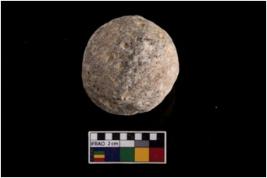 | Description / विवरण | A complete specimen of a spherical shaped terracotta slingball with a flat base . |