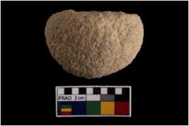 | Description / विवरण | A partially broken specimen of a terracotta sling ball |