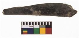 | Description / विवरण | A triangular bone point broken from the tip. It is patinated. |