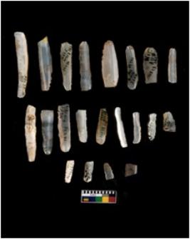| Description / विवरण | THERE ARE TOTAL N-21 BLADES IN THE ASSAMBLANGE . OUT OF THEM N-20 ARE MADE OF CHALCEDONY AND N-1 IS MADE OF JASPER . ALL THE BLADES ARE WITH RETOUCH ALL ALONG ON BOTH SIDES . |