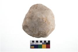 | Description / विवरण | A partially broken specimen of roughly round shaped hammer stone with battered periphery along with the circumference. It is broken from one end. |