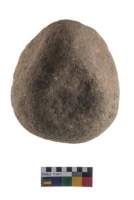 | Description / विवरण | A partially broken specimen of roughly round shaped hammer stone with battered periphery along with the circumference. It is broken from one end. |