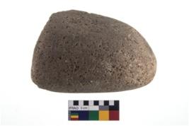 | Description / विवरण | A partially broken specimen of a oval shaped mueller stone with oval section. Prolonged used leads to a rounding and smoothening of the surface of the artifact.. |