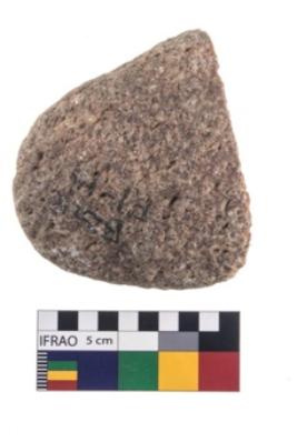 | Description / विवरण | A partially broken specimen of an oval shaped rubber stone with oval section and flat and roughly surface. |