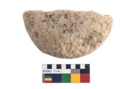 | Description / विवरण | A partially broken specimen of a oval shaped mueller stone with oval section. Prolonged used leads to a rounding and smoothening of the surface of the artifact. |
