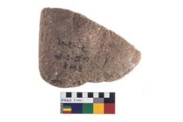 | Description / विवरण | A partially broken specimen of a oval shaped mueller stone with oval section. Prolonged used leads to a rounding and smoothening of the surface of the artifact. |