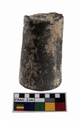 | Description / विवरण | Apartially broken specimen of a medium sized terracotta cylindrical object with elongated body and truncated end with a smooth surface and flat base. It is having a slight depression at the top. It is devoid of any kind of wash. It is black ware, fine fabric and well fired. Probably a stopper. |