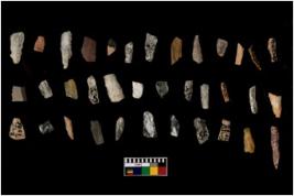 | Description / विवरण | THERE ARE TOTAL N- 36 MICROLITHS IN THE ASSEMBLANGE . AMONG THEM N-18 ARE MADE OF CHERT AND N-18 ARE MADE OF QUARTZ . OUT OF WHICH MOST ARE RETOUCHED ALL ALONG THE SIDES AND BLUNTED BACK BLADES , N-1 IS TRIANGLE BLADE AND REST ARE DEBITAGES . |
