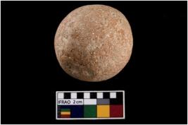 | Description / विवरण | A complete specimen of red ware teracotta sling ball with rough surface, probably a birdshot |