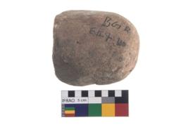 | Description / विवरण | A partially broken specimen of a oval shaped mueller stone with oval section. Prolonged used leads to a rounding and smoothening of the surface of the artifact. |
