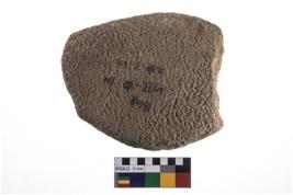 | Description / विवरण | A partially broken specimen of an oval shaped rubber stone with oval section and flat and roughly surface. |