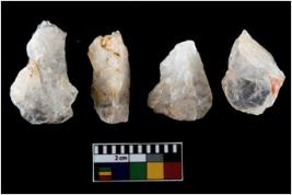 | Description / विवरण | There are n-4 of intact utilized flakes made up of Quartz. Some of them have bulge of percussion and some are flat flakes. |