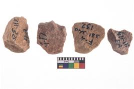 | Provenance / उद्गम/क्षेत्र | Bhimbetka, District-Raisen, BTK-, Trench-IIIF23, F4, E4, K9, E1, L-N A, Depth-331-340, 311-320, 111-115, 181-185, Artifact No.-132, 160, 195, 417, Date- N A |
