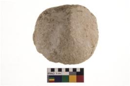 | Description / विवरण | A partially broken specimen of roughly round shaped hammer stone with battered periphery along with the circumference. |