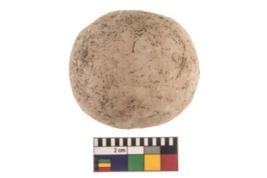 | Description / विवरण | A partially broken speciemen of stone sling ball. |