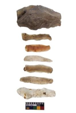 | Description / विवरण | Six blades and one microblade core. Blades have different sizes and shapes. They are all made on siliceous raw material |