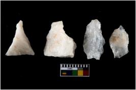| Description / विवरण | There are n-4 of intact utilized flakes made up of Quartz. Some of them have bulge of percussion and some are flat flakes. |
