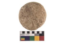 | Description / विवरण | A partially broken specimen of roughly round shaped hammer stone with battered periphery along with the circumference. |