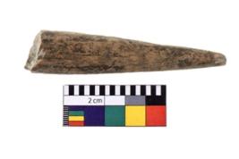 | Description / विवरण | A straight point with oval cross-section, broken at one end and has dark yellowish brown colour. |