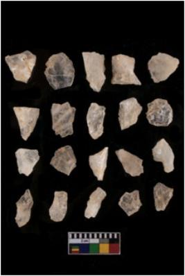 | Description / विवरण | There are n-20 of intact flake cores made up of Quartz. Some of them have bulge of percussion and some are flat flakes. |