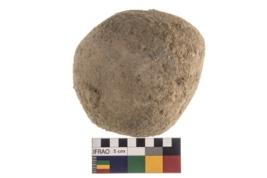 | Description / विवरण | A partially broken specimen of roughly round shaped hammer stone with battered periphery along with the circumference. |