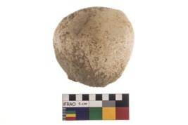 | Description / विवरण | A partially broken specimen of roughly round shaped hammer stone with battered periphery along with the circumference. |