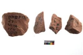 | Description / विवरण | Specimen of flake tools with prominent flaking marks. Made up of a short flakes with sides trimmed. |