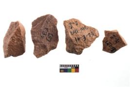 | Description / विवरण | Specimen of flake tools with prominent flaking marks. Made up of a short flakes with sides trimmed. |